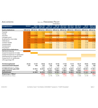 Auf Basis von Bauteilaufbauten und Energiebedarfsberechnungen wurden mehrere Varianten hinsichtlich Energieeinsparpotential, Baukosten und möglicher Zuschüsse miteinander verglichen.